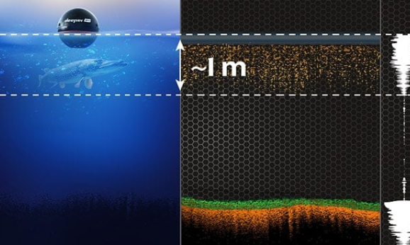 Количество помех и размер этой слепой зоны можно уменьшить, увеличив частоту сонара. Поэтому, если у вас Deeper PRO и вы видите много помех на поверхности, переключитесь на сканирование с более высокой частотой ( узкий луч 290 кГц, 15°). В случае Deeper START частота сонара 120 кГц позволяет улавливать помехи на поверхности до 1 метра / 3,3 фута под поверхностью воды.