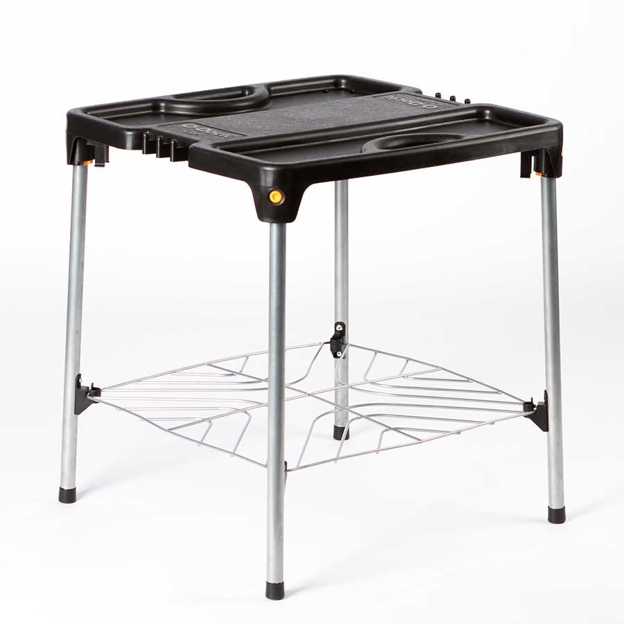 Портативный складной столик O-DOCK LITE — еще одна версия для удобного и надежного размещения грилей O-GRILL. Подходит для всех моделей газовых грилей O-GRILL. Прочная пластиковая столешница с выемками для ножек гриля. В столешницу надежно монтируются легкие и прочные стальные ножки, которые надежно фиксируются стопорными кнопками. В нижней части стола быстро и надежно крепится дополнительная легкая и прочная стальная сетчатая полка. По краям столешницы расположены крючки для подвешивания аксессуаров для гриллинга, что позволят держать инструмент для барбекю всегда под рукой. С обратной стороны столешницы расположены специальные захваты, в которые одним движением закрепляются ножки стола и сетчатая полка при демонтаже. Т.е. ничего не нужно из деталей при разборке стола отдельно во что-то упаковывать или привязывать к столешнице. Все уже продумано так, чтобы столик не доставлял забот при монтаже-демонтаже, переноске и перевозке. Размер в сложенном состоянии всего 55х55х10 (!) см — идеально для перевозке в авто. Еще один хороший плюс — ручки для переноски, отлитые заодно со столешницей. Очень легкий — 3,25 кг.