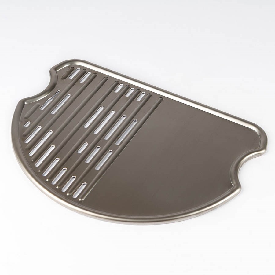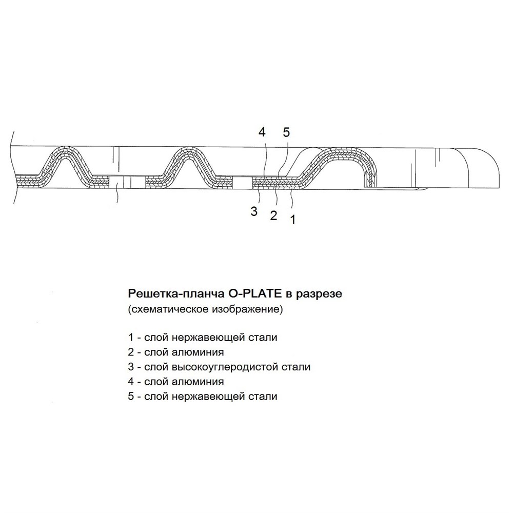 Используется в качестве сменного дополнительного аксессуара к базовой жарочной поверхности (литой массивной чугунной решетке гриля). Решетка O-PLATE специально разработана с целью расширения и без того больших возможностей грилей O-GRILL. Половину жарочной поверхности O-PLATE занимает сплошная (не решетчатая) плоскость, на которой удобно выпекать блинчики, оладьи, сырники, яичницу, омлет, дессерты. На решетчатой же половине можно также, как и на чугунной решетке, готовить традиционные блюда-гриль (колбаски, мясо, рыбу и т.д.). Конструкция биметаллической решетки запатентована. Схематическое изображение решетки в разрезе — см. блок дополнительных фотографий.